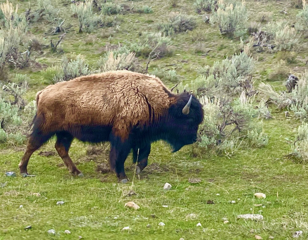 By the way, we loved our campground just outside the park. Yellowstone RV Park sits above the Yellowstone River, nestled in the surrounding hills. Our camper backed up to the river, and we watched bison and elk traverse the hills above us almost every day (we also saw elk in the dog park area of the campground, but kept our distance!)